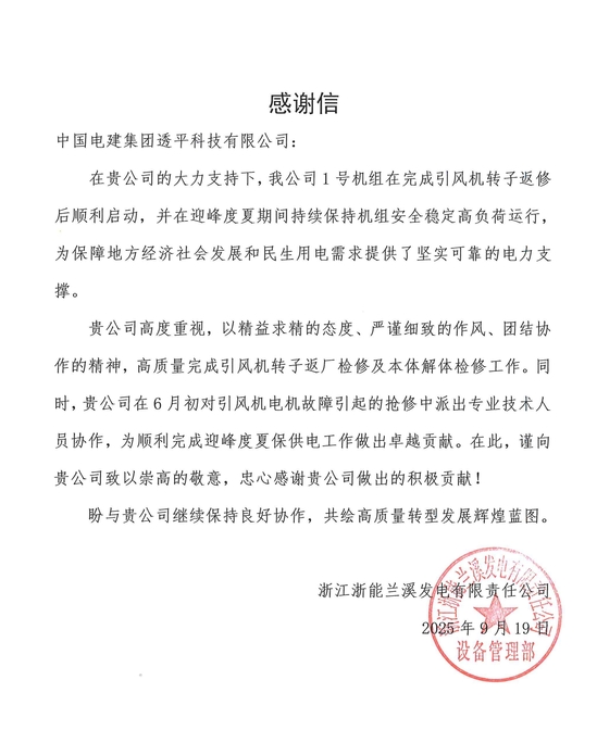 近日,浙江浙能兰溪发电有限责任公司特向透平科技公司发来感谢信,对公司在“迎峰度夏”保电工作中作出的卓越贡献表示诚挚感谢,为双方继续保持良好协作奠定了坚实基础。 为全力配合做好“迎峰度夏”保电工作,透平科技公司在接到浙江浙能兰溪发电有限责任公司1号机组引风机面临转子返修紧急需求后,快速反应,高效统筹,不仅在6月初引风机电机突发故障的关键节点,火速派出经验丰富的技术人员赶赴现场,同时组建专业素养过硬、实战经验丰富的团队,全力以赴在最短的时间内高质量完成转子返厂检修及本体解体检修等核心工作,实现了机组快速恢复高负荷安全稳定运行,有力保障了“迎峰度夏”负荷高峰期用电需求,为地方经济社会有序发展和民生用电稳定供给筑牢了坚实的电力屏障。 此次合作的圆满成功,既是透平科技公司多年深耕风机领域积累的技术实力,更是双方以“保障能源安全”为共同目标,携手践行社会责任的有力见证。未来,透平科技公司将继续秉持专业精神,深耕风机技术研发、检修服务领域,持续提升核心竞争力,与更多合作伙伴携手共进,共同绘制高质量转型发展的辉煌蓝图,为能源保供事业贡献更多“透平力量”。 | |||
