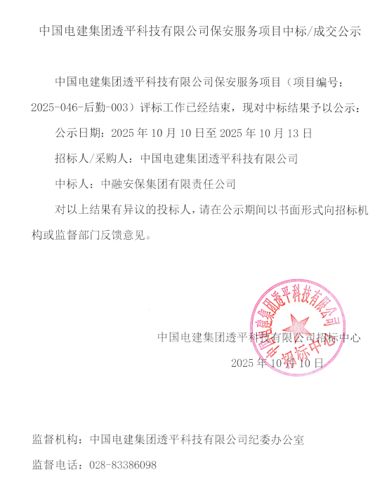 中国电建集团透平科技有限公司保安服务项目中标/成交公示